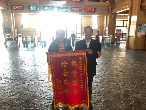 6月24日,池西游客服務(wù)中心副經(jīng)理王金鵬又接待了一位前來贈(zèng)送錦旗的游客。因?yàn)榘矙z員王波在6月13日,拾到一部三星手機(jī),并及時(shí)上交,通過多方了解才知道,失主是一位韓國游客,手機(jī)的及時(shí)歸還也為該游客省去了很多不必要的麻煩。所以,委托旅行社贈(zèng)送錦旗一面,稱贊王波拾金不昧的精神。同時(shí)這也是這個(gè)月里池西游客服務(wù)中心第二次有游客贈(zèng)送錦旗,這是對(duì)景區(qū)員工優(yōu)質(zhì)服務(wù)高度的認(rèn)可與贊揚(yáng)。