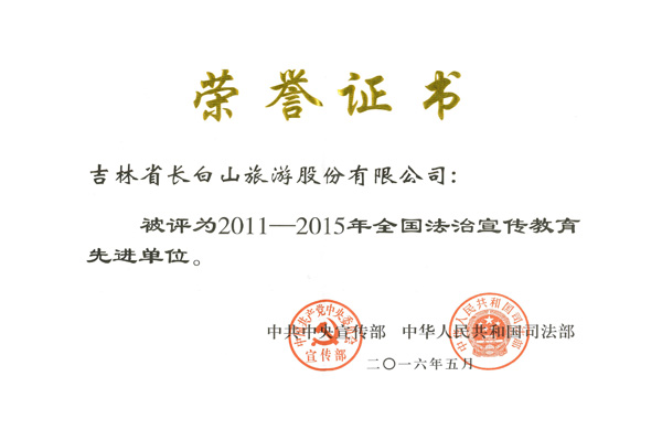 公司在開(kāi)展2011-2015年“六五”普法工作期間,認(rèn)真落實(shí)依法治國(guó)方略和長(zhǎng)白山保護(hù)開(kāi)發(fā)區(qū)依法治區(qū)工作領(lǐng)導(dǎo)小組辦公室《關(guān)于印發(fā)長(zhǎng)白山保護(hù)開(kāi)發(fā)區(qū)2013年依法治區(qū)暨創(chuàng)建“法治長(zhǎng)白山”工作實(shí)施方案的通知》、《關(guān)于法治長(zhǎng)白山創(chuàng)建活動(dòng)的實(shí)施意見(jiàn)》精神,在長(zhǎng)白山保護(hù)開(kāi)發(fā)區(qū)依法治區(qū)工作領(lǐng)導(dǎo)小組的指導(dǎo)下,公司依法治司工作領(lǐng)導(dǎo)小組的帶領(lǐng)下,不斷創(chuàng)新普法宣傳教育,依法開(kāi)展各項(xiàng)經(jīng)營(yíng)活動(dòng),法治建設(shè)工作取得了顯著成效,于2016年5月被中共中央宣傳部和中華人民共和國(guó)司法部評(píng)為“2011-2015年全國(guó)法治宣傳教育先進(jìn)單位”。