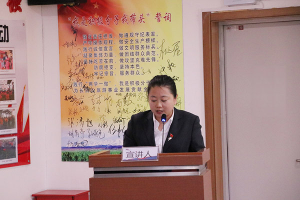 4月的長白山,初寒乍暖,略帶一絲絲春意,在這個充滿活力與希望的季節(jié)里,16日,長白山北景區(qū)黨支部在“新時代傳習(xí)所”,開展了“走進(jìn)新時代 肩負(fù)新使命 踐行新理念”的宣講活動,活動由北景區(qū)黨支部副書記王慧君主持。