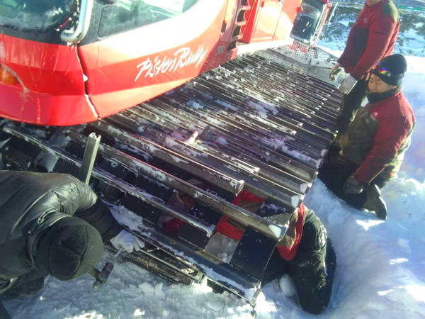 11月16日清晨,雪地車在長白山北主峰公路黑風(fēng)口清雪作業(yè)時,出現(xiàn)前拐軸折斷故障,無法繼續(xù)正常作業(yè)。北景區(qū)檢修部接到報告后,迅速抽調(diào)經(jīng)驗豐富的檢修技工攜帶搶修工具和配件前往現(xiàn)場展開維修。