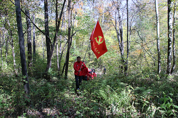 在隨風(fēng)飄揚的黨旗下,全體黨員前往老黑河遺址,深入密林深處,崎嶇的山路,行走在山林草莽之間,感受當(dāng)時的艱苦斗爭環(huán)境,體驗革命烈士走過的抗聯(lián)路。